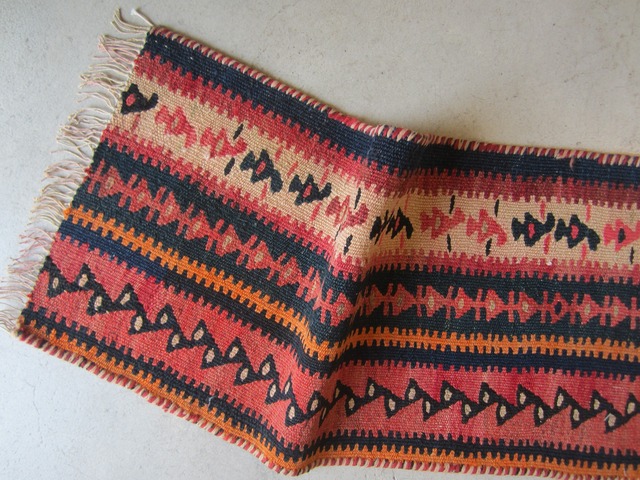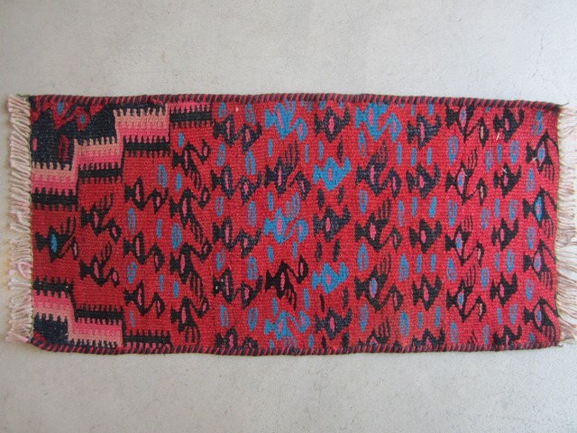 イランのオールドキリム 50年以上前のキリムをカットしています 存在感のある珍しい柄 玄関やベットサイド 植木などの下に敷いてコーナーをつくったり お楽しみください サイズ 約67×31 イラン製 羊毛 お手入れは手洗いで軽く脱水し 陰干しを