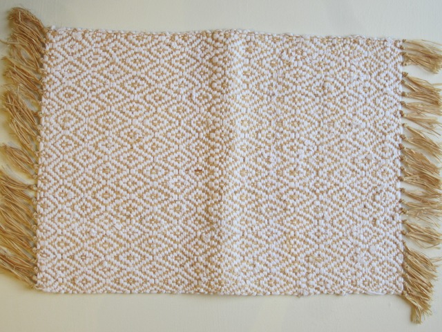 ナチュラルカラーはラフィア(ヤシの木の皮の繊維) と白のコットン生地で編まれたマット 細かく丁寧な柄がとても美しいです ランチョンマットサイズなので テーブルの中央に置いたり 花瓶などの下や棚に敷いても サイズ 42×30(フリンジ部分含まず) ラフィア コットン マダガスカル製
