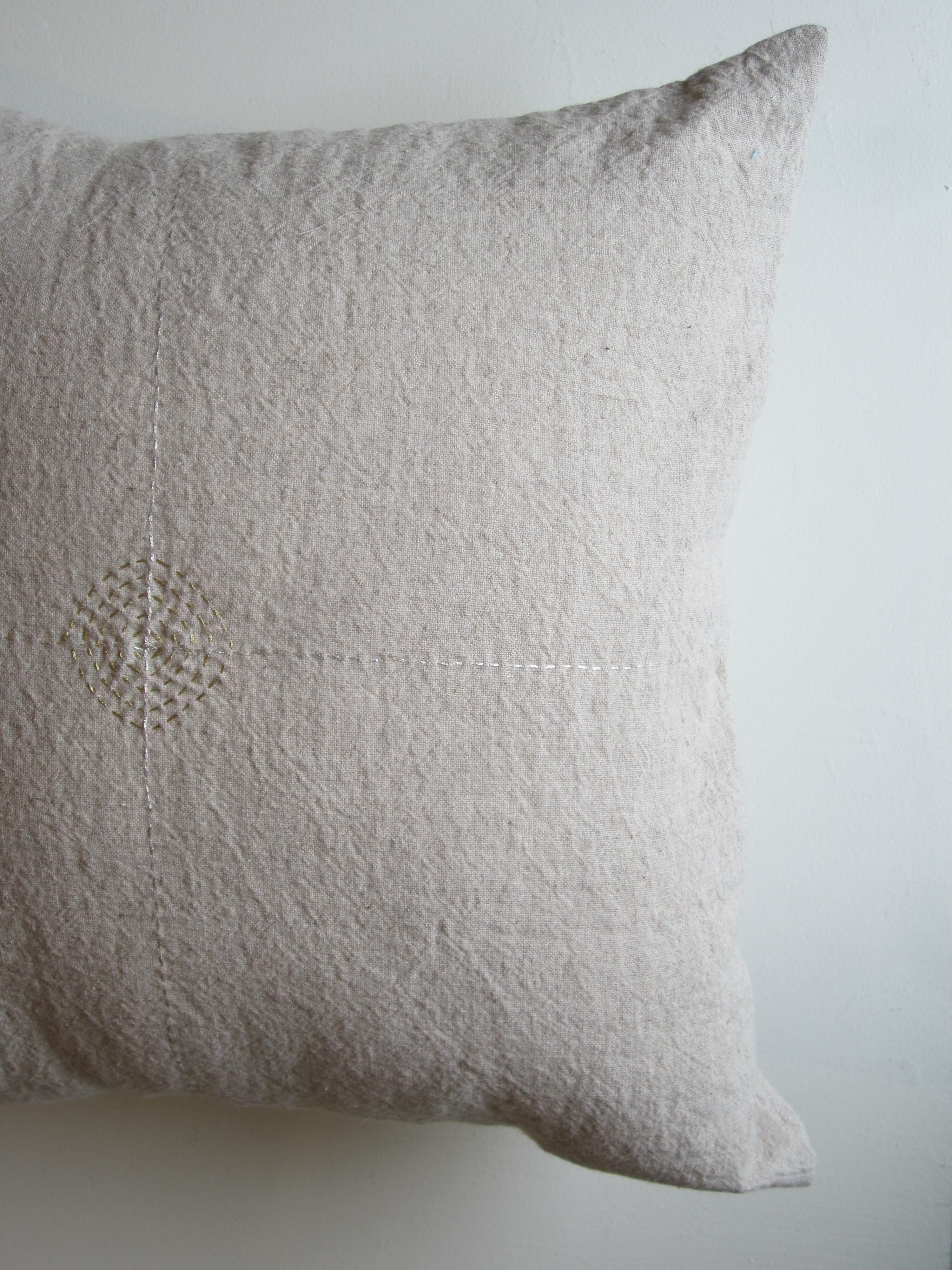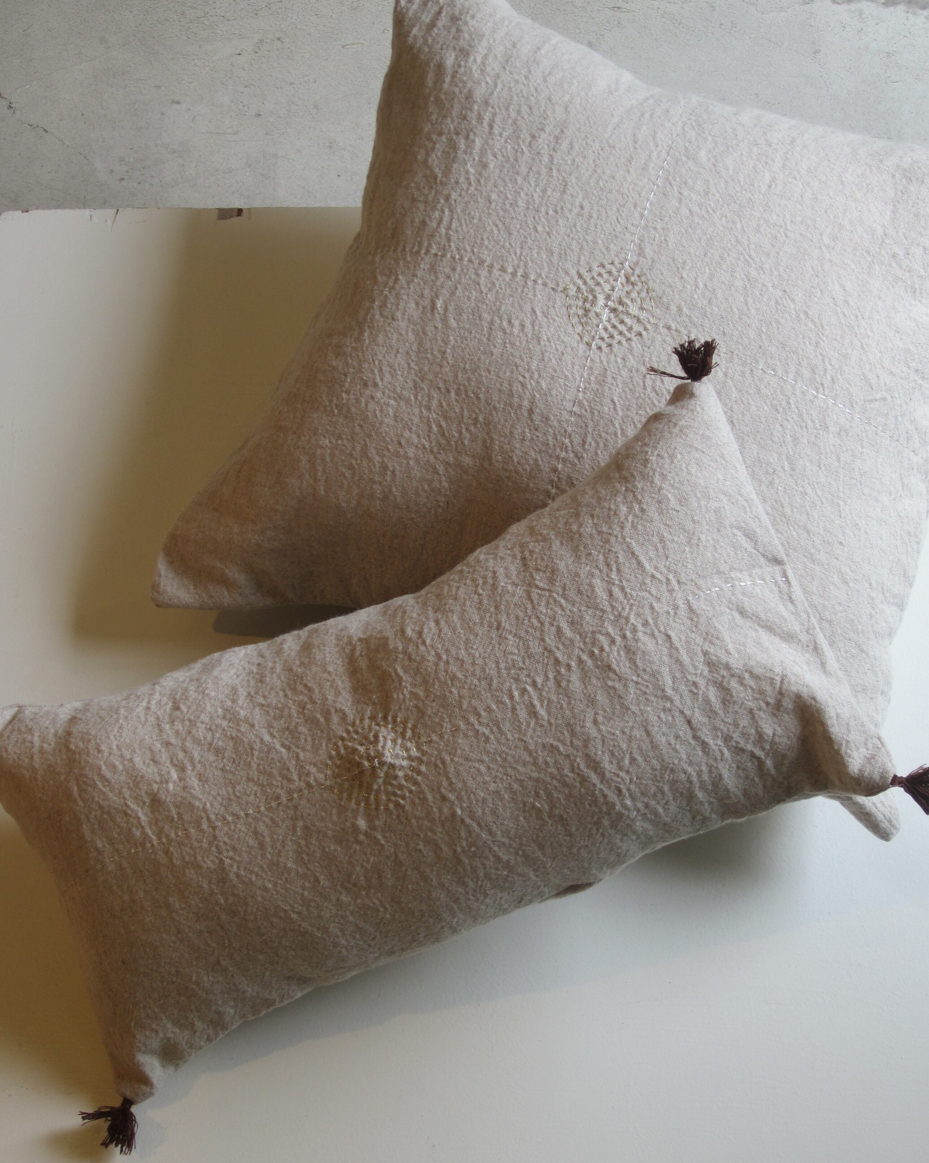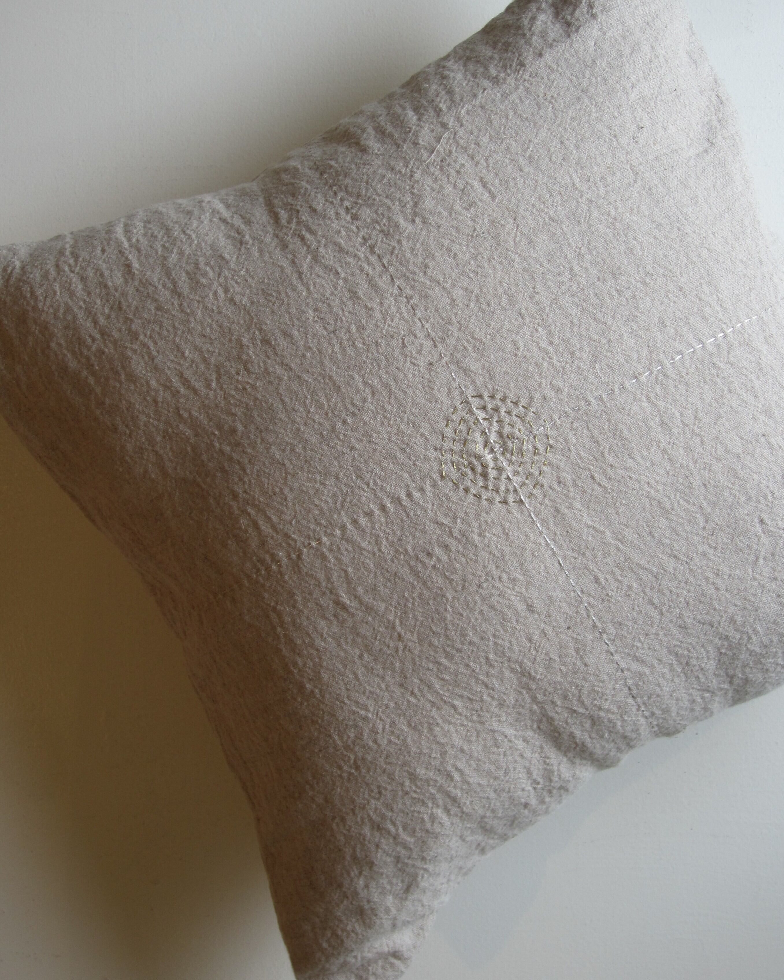 リネンにシルバーとゴールドで刺繍が施されたクッションカバー