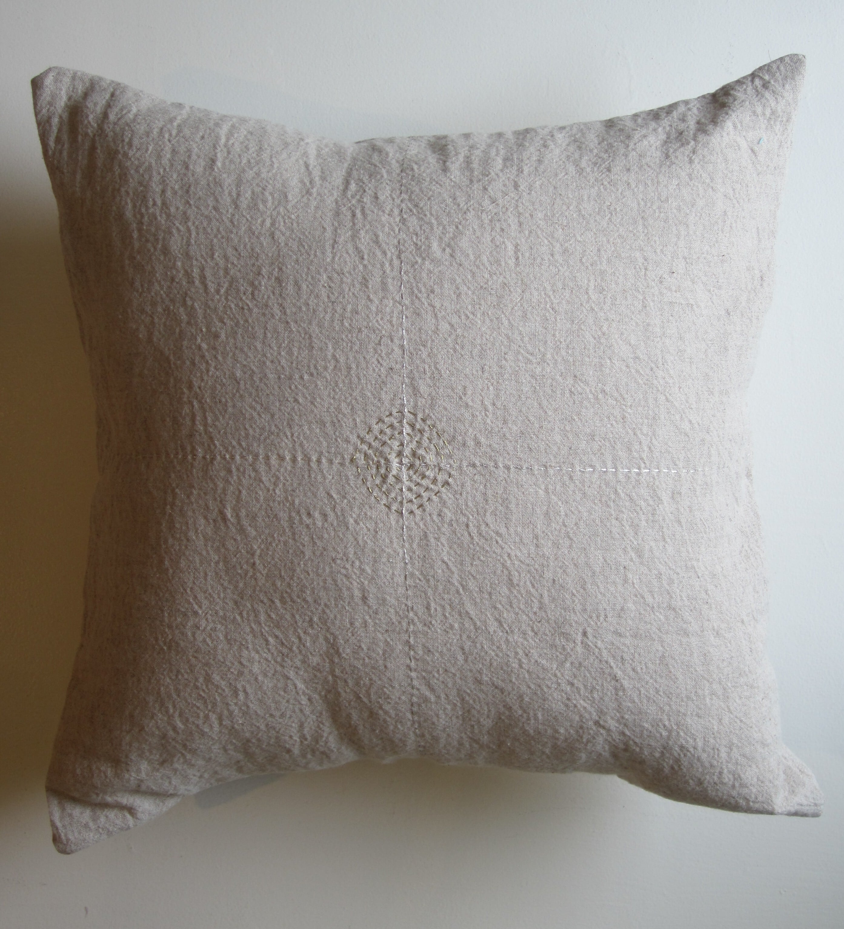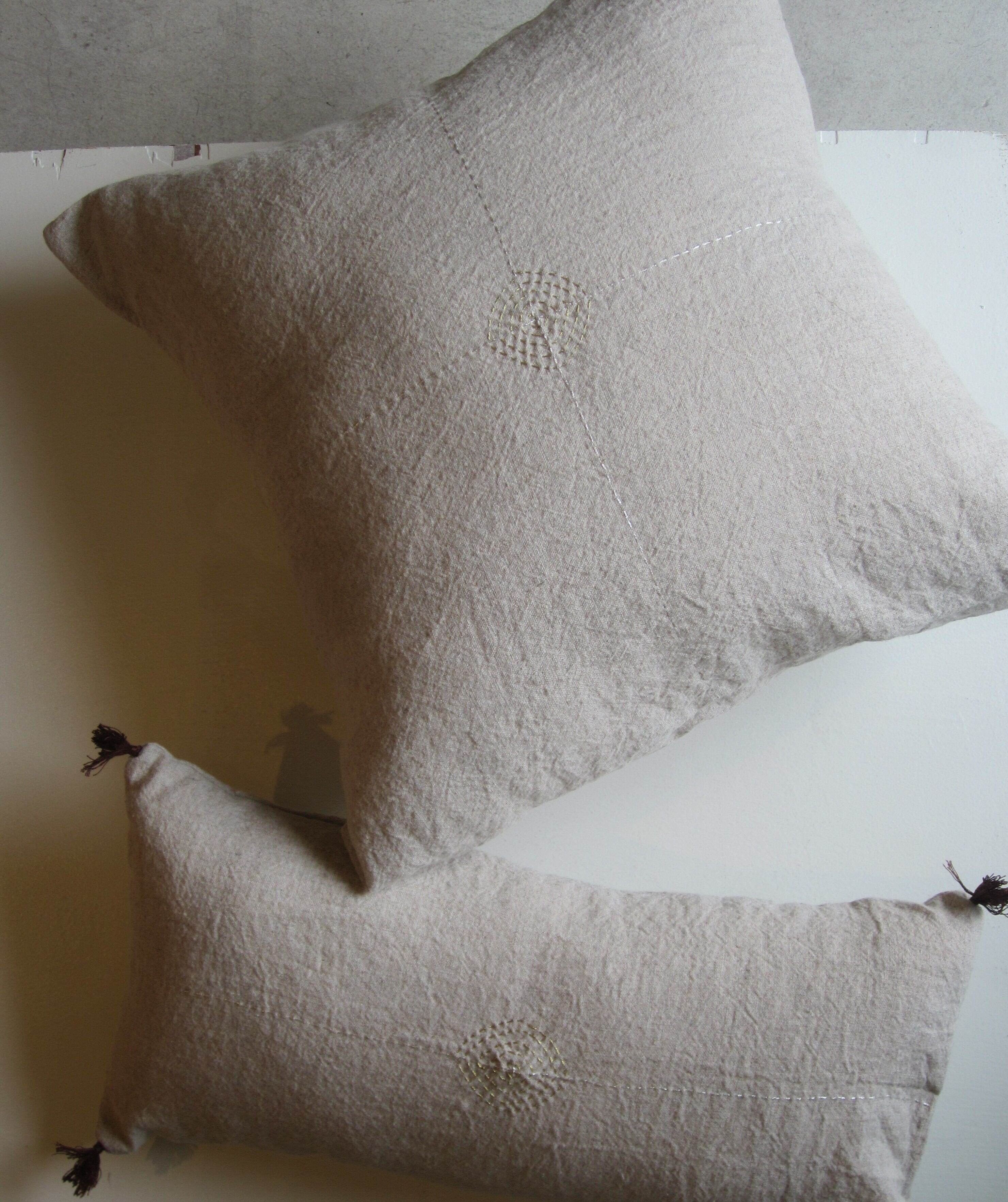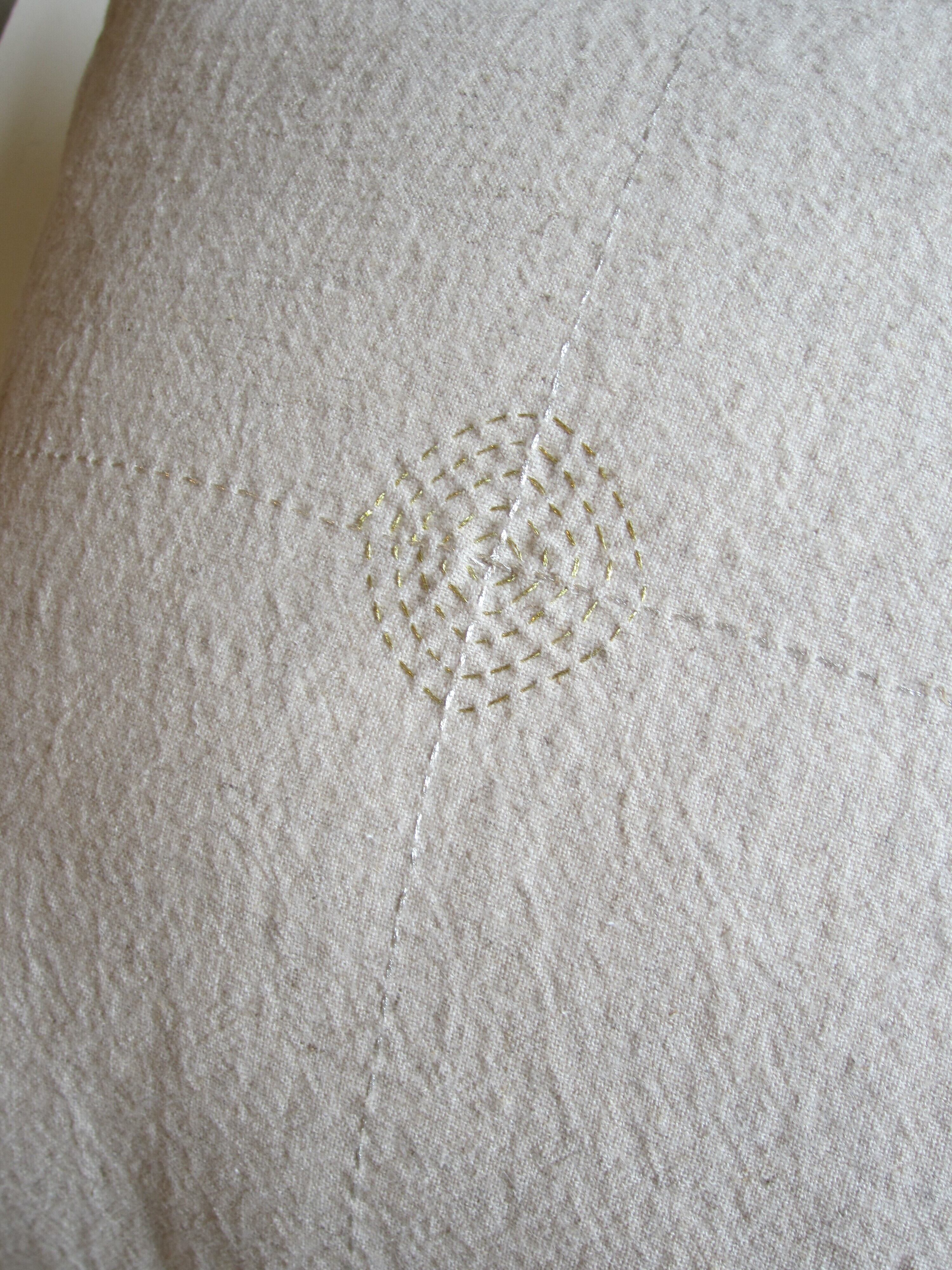 リネンにシルバーとゴールドで刺繍が施されたクッションカバー